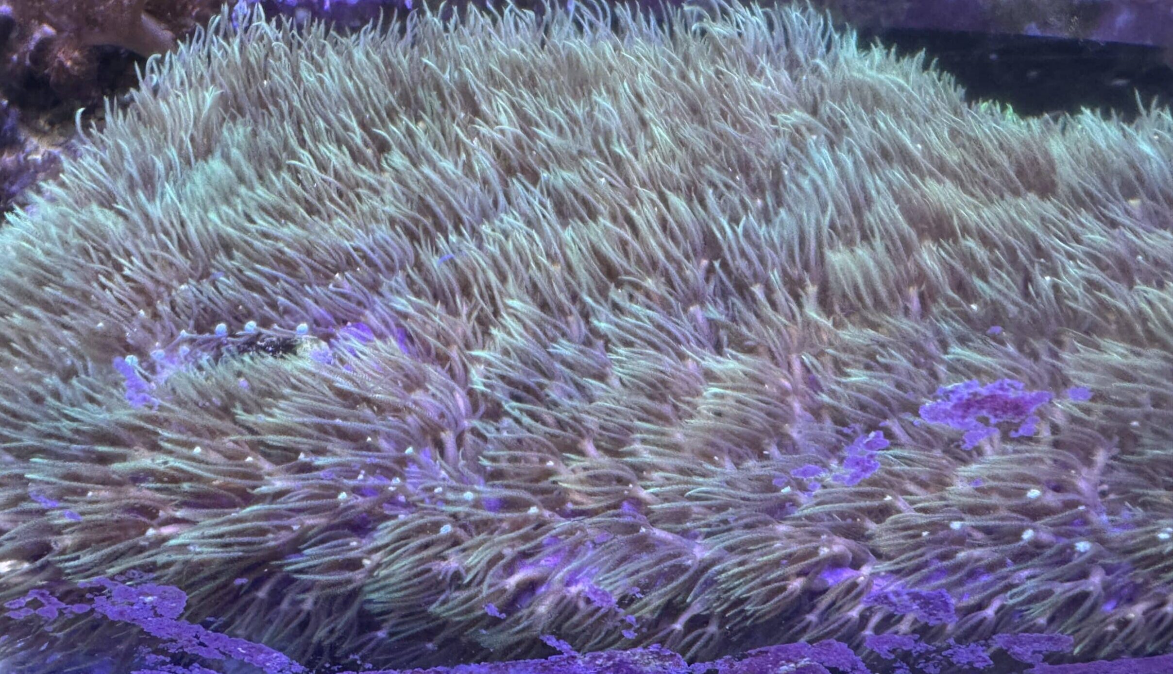 The GSP is the standard green star polyp type, short green tentacle, white center, purple mat, fast grower. Great for live growth coverings for equipment, overflows, stacks and walls. It is Aquacultured here at PJS.